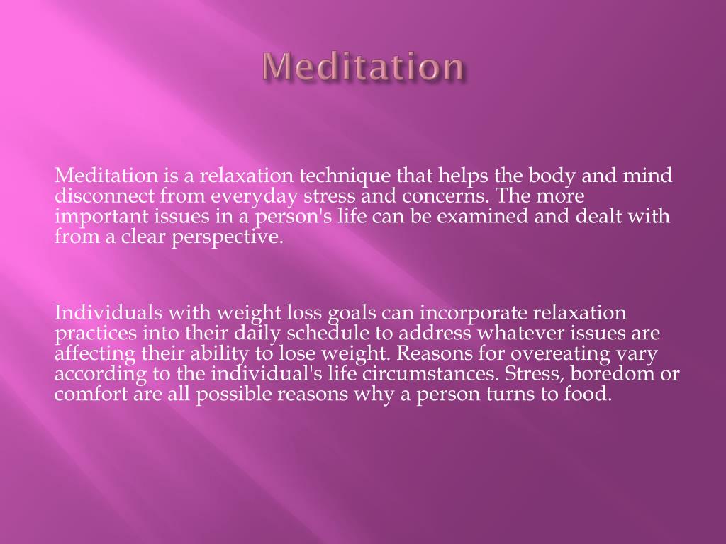 Meditation Meditation is a relaxation technique that helps the body and mind disconnect from everyday stress and concerns. The more important issues in a person's life can be examined and dealt with from a clear perspective. Individuals with weight loss goals can incorporate relaxation practices into their daily schedule to address whatever issues are affecting their ability to lose weight. Reasons for overeating vary according to the individual's life circumstances. Stress, boredom or comfort are all possible reasons why a person turns to food.