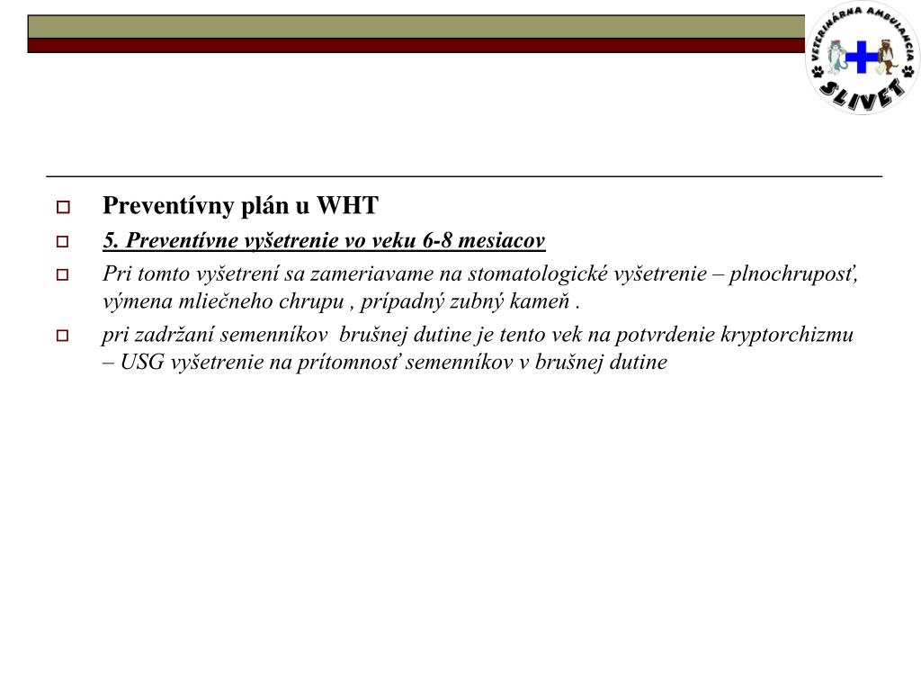 Preventívny plán u WHT • 5. Preventívne vyšetrenie vo veku 6-8 mesiacov • Pri tomto vyšetrení sa zameriavame na stomatologické vyšetrenie – plnochruposť, výmena mliečneho chrupu , prípadný zubný kameň . • pri zadržaní semenníkov brušnej dutine je tento vek na potvrdenie kryptorchizmu – USG vyšetrenie na prítomnosť semenníkov v brušnej dutine