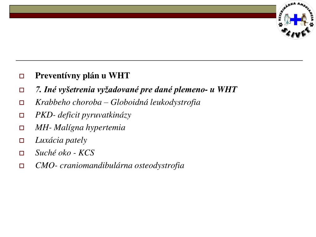 Preventívny plán u WHT • 7. Iné vyšetrenia vyžadované pre dané plemeno- u WHT • Krabbeho choroba – Globoidná leukodystrofia • PKD- deficit pyruvatkinázy • MH- Malígna hypertemia • Luxácia pately • Suché oko - KCS • CMO- craniomandibulárna osteodystrofia