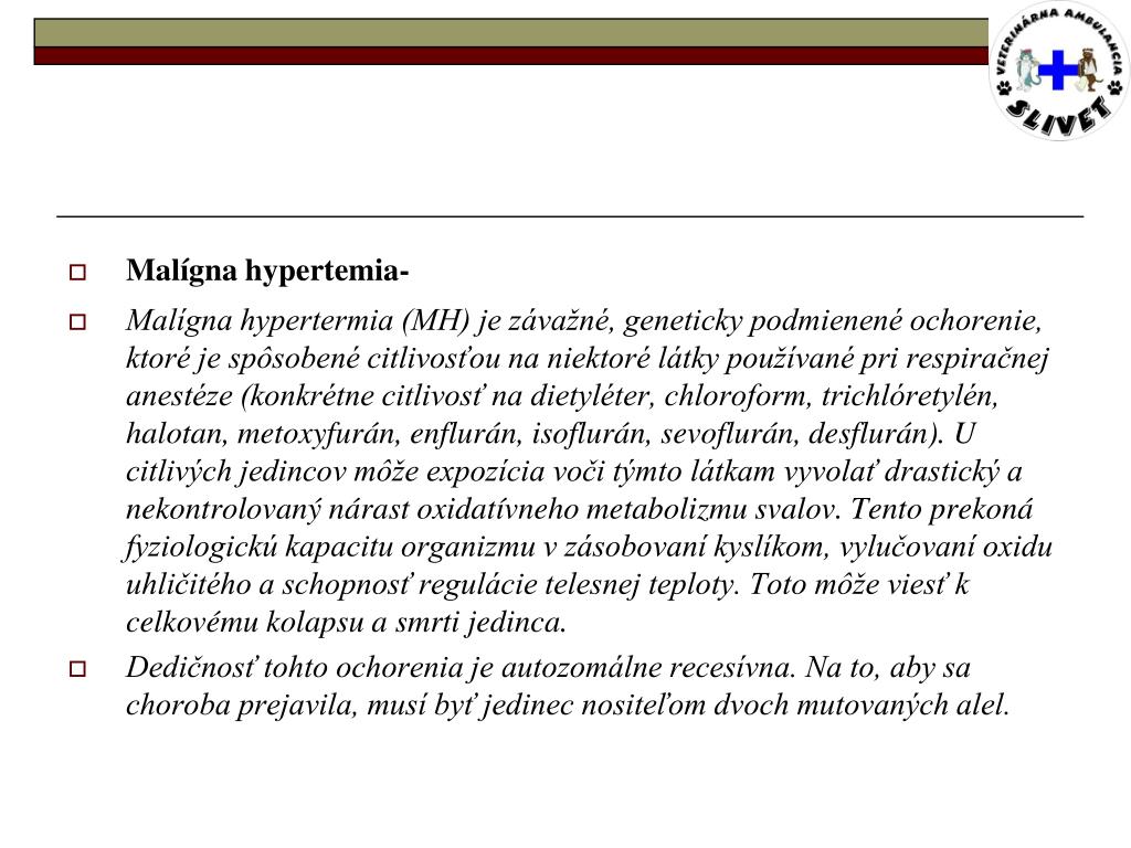 Malígna hypertemia- • Malígna hypertermia (MH) je závažné, geneticky podmienené ochorenie, ktoré je spôsobené citlivosťou na niektoré látky používané pri respiračnej anestéze (konkrétne citlivosť na dietyléter, chloroform, trichlóretylén, halotan, metoxyfurán, enflurán, isoflurán, sevoflurán, desflurán). U citlivých jedincov môže expozícia voči týmto látkam vyvolať drastický a nekontrolovaný nárast oxidatívneho metabolizmu svalov. Tento prekoná fyziologickú kapacitu organizmu v zásobovaní kyslíkom, vylučovaní oxidu uhličitého a schopnosť regulácie telesnej teploty. Toto môže viesť k celkovému kolapsu a smrti jedinca. • Dedičnosť tohto ochorenia je autozomálne recesívna. Na to, aby sa choroba prejavila, musí byť jedinec nositeľom dvoch mutovaných alel.