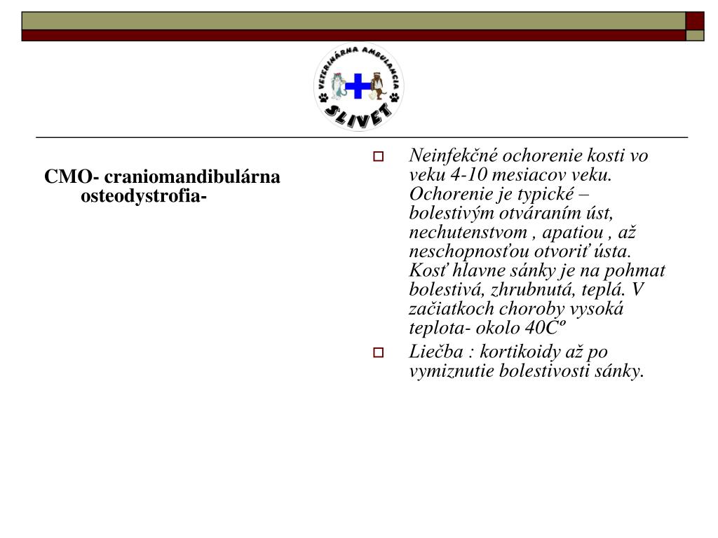 CMO- craniomandibulárna osteodystrofia- Neinfekčné ochorenie kosti vo veku 4-10 mesiacov veku. Ochorenie je typické – bolestivým otváraním úst, nechutenstvom , apatiou , až neschopnosťou otvoriť ústa. Kosť hlavne sánky je na pohmat bolestivá, zhrubnutá, teplá. V začiatkoch choroby vysoká teplota- okolo 40Cº Liečba : kortikoidy až po vymiznutie bolestivosti sánky.
