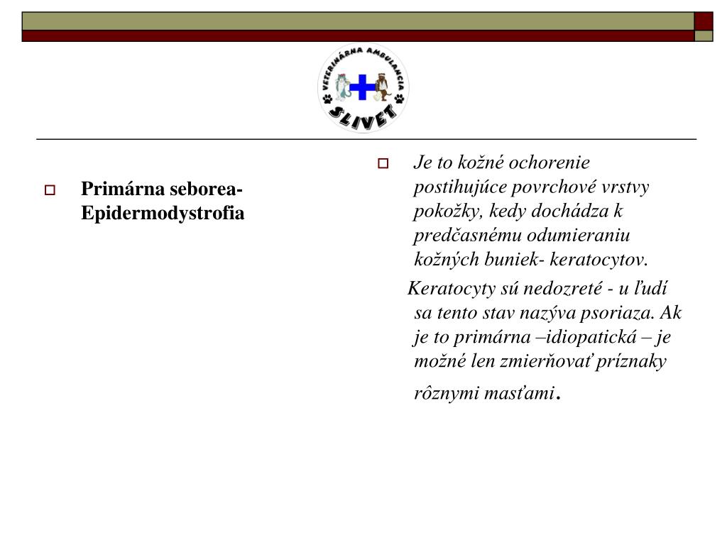 Primárna seborea- Epidermodystrofia Je to kožné ochorenie postihujúce povrchové vrstvy pokožky, kedy dochádza k predčasnému odumieraniu kožných buniek- keratocytov. Keratocyty sú nedozreté - u ľudí sa tento stav nazýva psoriaza. Ak je to primárna –idiopatická – je možné len zmierňovať príznaky rôznymi masťami.