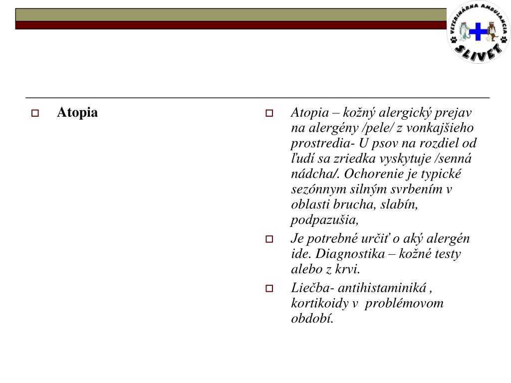 Atopia Atopia – kožný alergický prejav na alergény /pele/ z vonkajšieho prostredia- U psov na rozdiel od ľudí sa zriedka vyskytuje /senná nádcha/. Ochorenie je typické sezónnym silným svrbením v oblasti brucha, slabín, podpazušia, Je potrebné určiť o aký alergén ide. Diagnostika – kožné testy alebo z krvi. Liečba- antihistaminiká , kortikoidy v problémovom období.