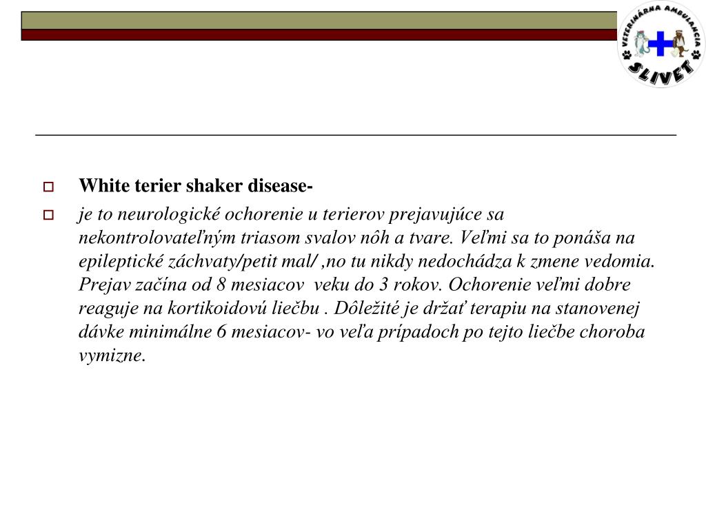 White terier shaker disease- • je to neurologické ochorenie u terierov prejavujúce sa nekontrolovateľným triasom svalov nôh a tvare. Veľmi sa to ponáša na epileptické záchvaty/petit mal/ ,no tu nikdy nedochádza k zmene vedomia. Prejav začína od 8 mesiacov veku do 3 rokov. Ochorenie veľmi dobre reaguje na kortikoidovú liečbu . Dôležité je držať terapiu na stanovenej dávke minimálne 6 mesiacov- vo veľa prípadoch po tejto liečbe choroba vymizne.