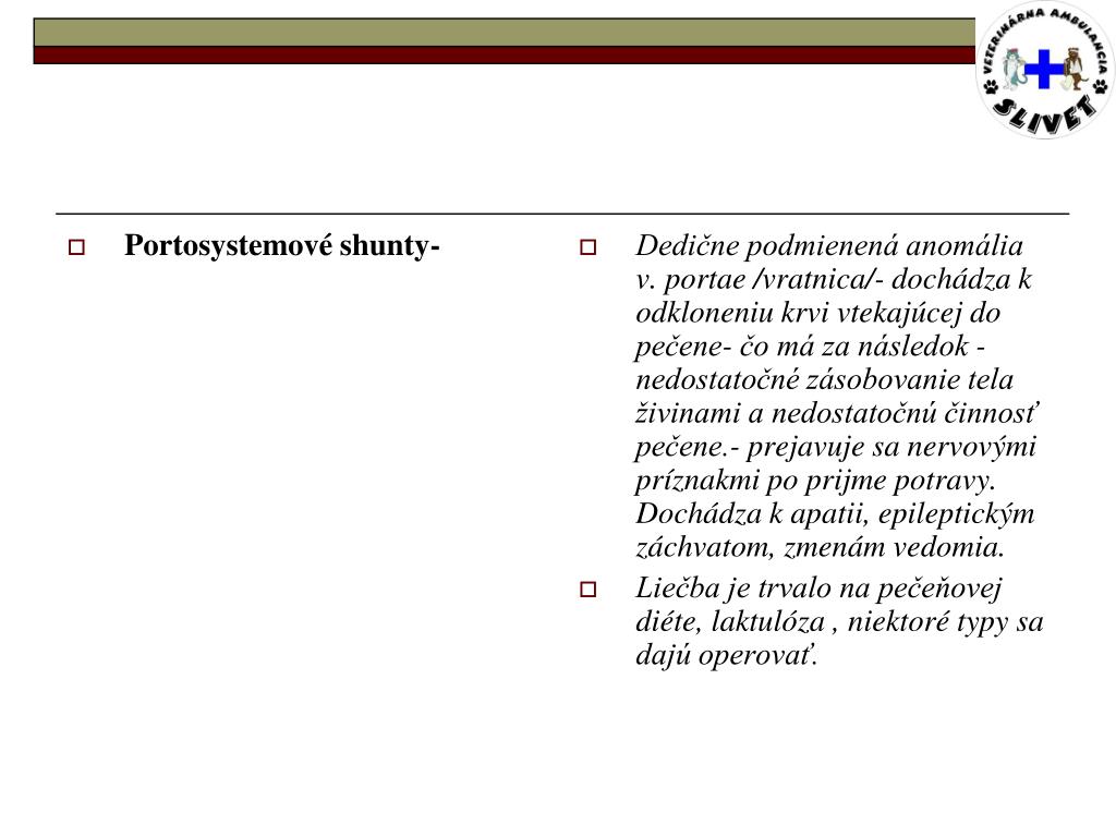Portosystemové shunty- Dedične podmienená anomália v. portae /vratnica/- dochádza k odkloneniu krvi vtekajúcej do pečene- čo má za následok -nedostatočné zásobovanie tela živinami a nedostatočnú činnosť pečene.- prejavuje sa nervovými príznakmi po prijme potravy. Dochádza k apatii, epileptickým záchvatom, zmenám vedomia. Liečba je trvalo na pečeňovej diéte, laktulóza , niektoré typy sa dajú operovať.