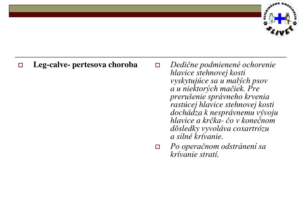 Leg-calve- pertesova choroba Dedične podmienené ochorenie hlavice stehnovej kosti vyskytujúce sa u malých psov a u niektorých mačiek. Pre prerušenie správneho krvenia rastúcej hlavice stehnovej kosti dochádza k nesprávnemu vývoju hlavice a krčka- čo v konečnom dôsledky vyvoláva coxartrózu a silné krívanie. Po operačnom odstránení sa krívanie stratí.