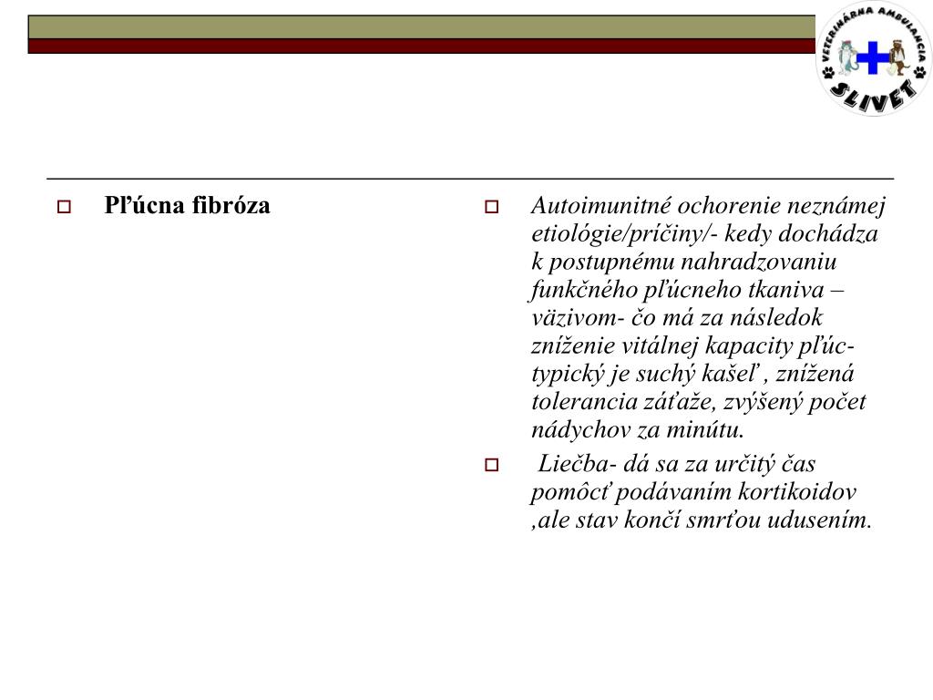 Pľúcna fibróza Autoimunitné ochorenie neznámej etiológie/príčiny/- kedy dochádza k postupnému nahradzovaniu funkčného pľúcneho tkaniva – väzivom- čo má za následok zníženie vitálnej kapacity pľúc- typický je suchý kašeľ , znížená tolerancia záťaže, zvýšený počet nádychov za minútu. Liečba- dá sa za určitý čas pomôcť podávaním kortikoidov ,ale stav končí smrťou udusením.