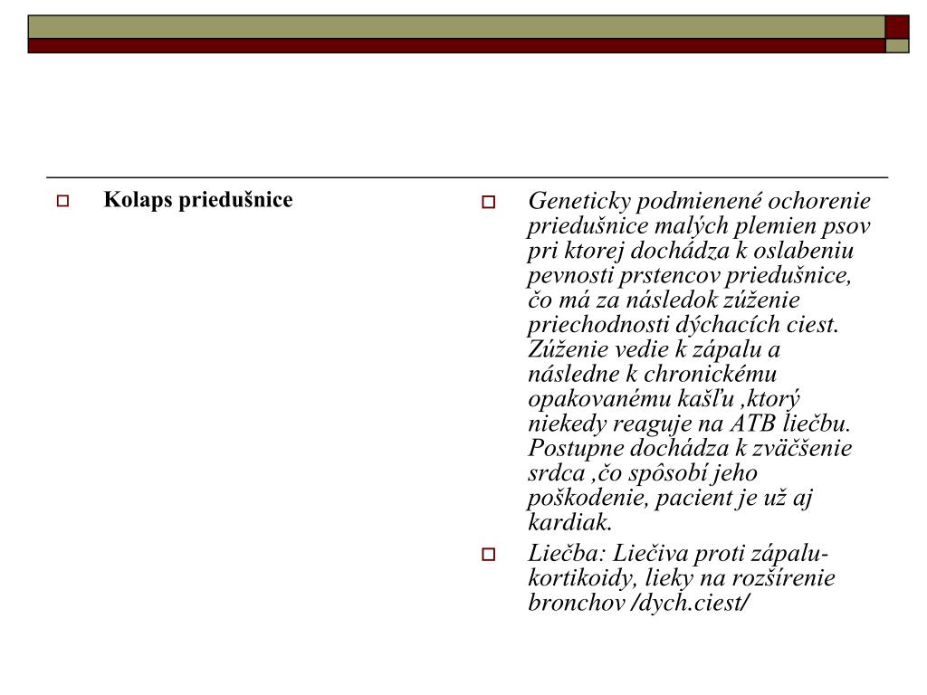 Kolaps priedušnice Geneticky podmienené ochorenie priedušnice malých plemien psov pri ktorej dochádza k oslabeniu pevnosti prstencov priedušnice, čo má za následok zúženie priechodnosti dýchacích ciest. Zúženie vedie k zápalu a následne k chronickému opakovanému kašľu ,ktorý niekedy reaguje na ATB liečbu. Postupne dochádza k zväčšenie srdca ,čo spôsobí jeho poškodenie, pacient je už aj kardiak. Liečba: Liečiva proti zápalu- kortikoidy, lieky na rozšírenie bronchov /dych.ciest/