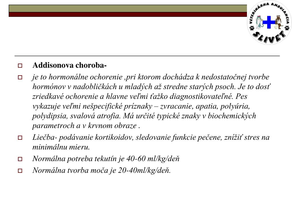 Addisonova choroba- • je to hormonálne ochorenie ,pri ktorom dochádza k nedostatočnej tvorbe hormónov v nadobličkách u mladých až stredne starých psoch. Je to dosť zriedkavé ochorenie a hlavne veľmi ťažko diagnostikovateľné. Pes vykazuje veľmi nešpecifické príznaky – zvracanie, apatia, polyúria, polydipsia, svalová atrofia. Má určité typické znaky v biochemických parametroch a v krvnom obraze . • Liečba- podávanie kortikoidov, sledovanie funkcie pečene, znížiť stres na minimálnu mieru. • Normálna potreba tekutín je 40-60 ml/kg/deň • Normálna tvorba moča je 20-40ml/kg/deň.