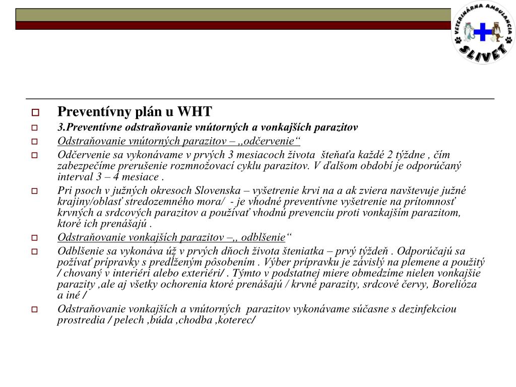 Preventívny plán u WHT • 3.Preventívne odstraňovanie vnútorných a vonkajších parazitov • Odstraňovanie vnútorných parazitov – ,,odčervenie“ • Odčervenie sa vykonávame v prvých 3 mesiacoch života šteňaťa každé 2 týždne , čím zabezpečíme prerušenie rozmnožovací cyklu parazitov. V ďalšom období je odporúčaný interval 3 – 4 mesiace . • Pri psoch v južných okresoch Slovenska – vyšetrenie krvi na a ak zviera navštevuje južné krajiny/oblasť stredozemného mora/ - je vhodné preventívne vyšetrenie na prítomnosť krvných a srdcových parazitov a používať vhodnú prevenciu proti vonkajším parazitom, ktoré ich prenášajú . • Odstraňovanie vonkajších parazitov –,, odblšenie“ • Odblšenie sa vykonáva úž v prvých dňoch života šteniatka – prvý týždeň . Odporúčajú sa požívať prípravky s predĺženým pôsobením . Výber prípravku je závislý na plemene a použitý / chovaný v interiéri alebo exteriéri/ . Týmto v podstatnej miere obmedzíme nielen vonkajšie parazity ,ale aj všetky ochorenia ktoré prenášajú / krvné parazity, srdcové červy, Borelióza a iné / • Odstraňovanie vonkajších a vnútorných parazitov vykonávame súčasne s dezinfekciou prostredia / pelech ,búda ,chodba ,koterec/