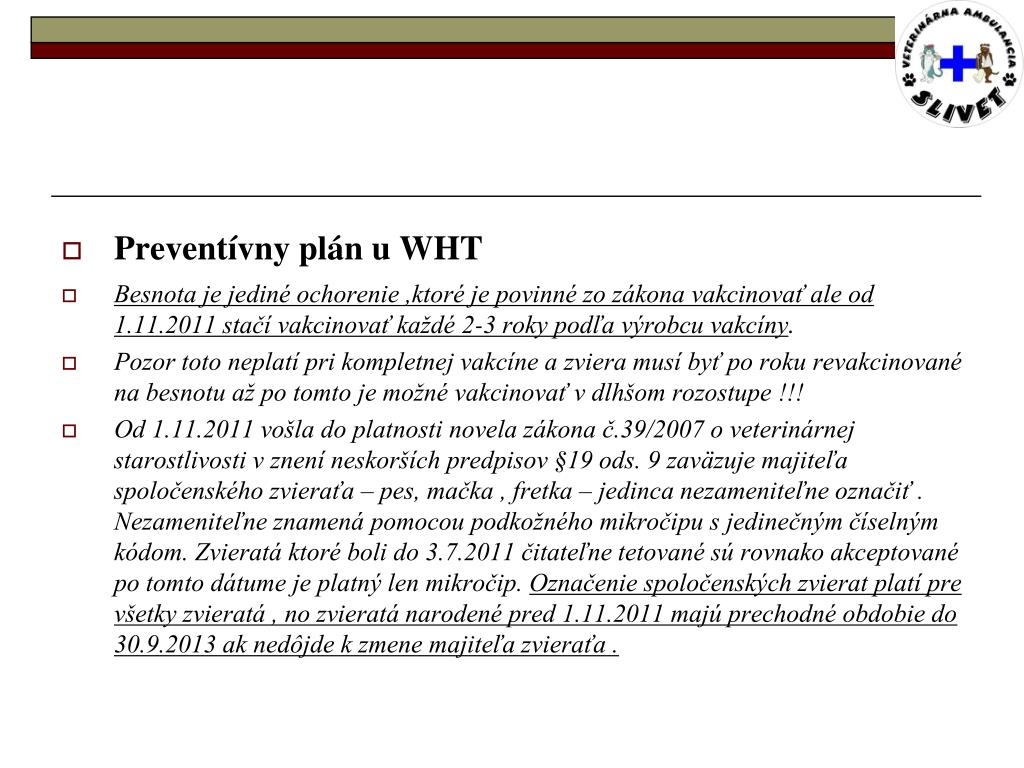 Preventívny plán u WHT • Besnota je jediné ochorenie ,ktoré je povinné zo zákona vakcinovať ale od 1.11.2011 stačí vakcinovať každé 2-3 roky podľa výrobcu vakcíny. • Pozor toto neplatí pri kompletnej vakcíne a zviera musí byť po roku revakcinované na besnotu až po tomto je možné vakcinovať v dlhšom rozostupe !!! • Od 1.11.2011 vošla do platnosti novela zákona č.39/2007 o veterinárnej starostlivosti v znení neskorších predpisov §19 ods. 9 zaväzuje majiteľa spoločenského zvieraťa – pes, mačka , fretka – jedinca nezameniteľne označiť . Nezameniteľne znamená pomocou podkožného mikročipu s jedinečným číselným kódom. Zvieratá ktoré boli do 3.7.2011 čitateľne tetované sú rovnako akceptované po tomto dátume je platný len mikročip. Označenie spoločenských zvierat platí pre všetky zvieratá , no zvieratá narodené pred 1.11.2011 majú prechodné obdobie do 30.9.2013 ak nedôjde k zmene majiteľa zvieraťa .