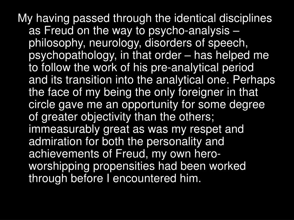 My having passed through the identical disciplines as Freud on the way to psycho-analysis – philosophy, neurology, disorders of speech, psychopathology, in that order – has helped me to follow the work of his pre-analytical period and its transition into the analytical one. Perhaps the face of my being the only foreigner in that circle gave me an opportunity for some degree of greater objectivity than the others; immeasurably great as was my respet and admiration for both the personality and achievements of Freud, my own hero-worshipping propensities had been worked through before I encountered him.