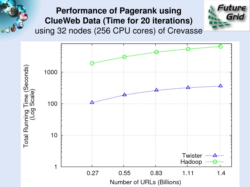 Johns Hopkins Notre Dame Iowa Penn State University of Florida Michigan State San Diego Supercomputer Center Univ.Illinois at Chicago Washington University University of Minnesota University of Texas at El Paso University of California at Los Angeles IBM Almaden Research Center 300+ Students learning about Twister & Hadoop MapReduce technologies, supported by FutureGrid. July 26-30, 2010 NCSA Summer School Workshop http://salsahpc.indiana.edu/tutorial Indiana University University of Arkansas