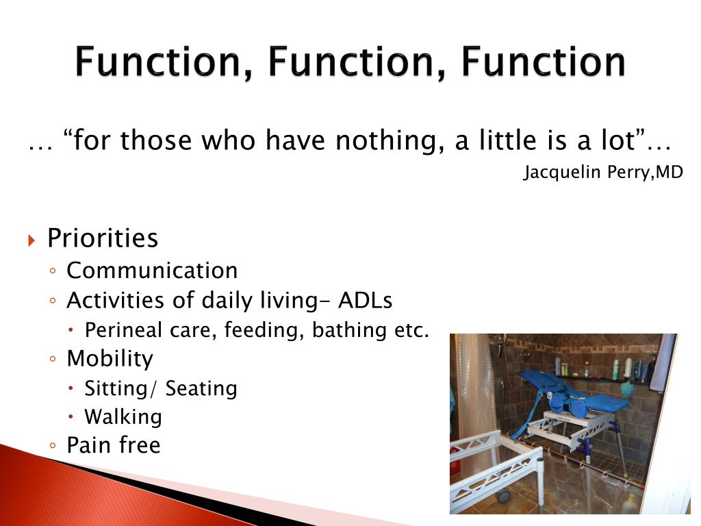 Function, Function, Function … “for those who have nothing, a little is a lot”… JacquelinPerry,MD • Priorities • Communication • Activities of daily living- ADLs • Perineal care, feeding, bathing etc. • Mobility • Sitting/ Seating • Walking • Pain free