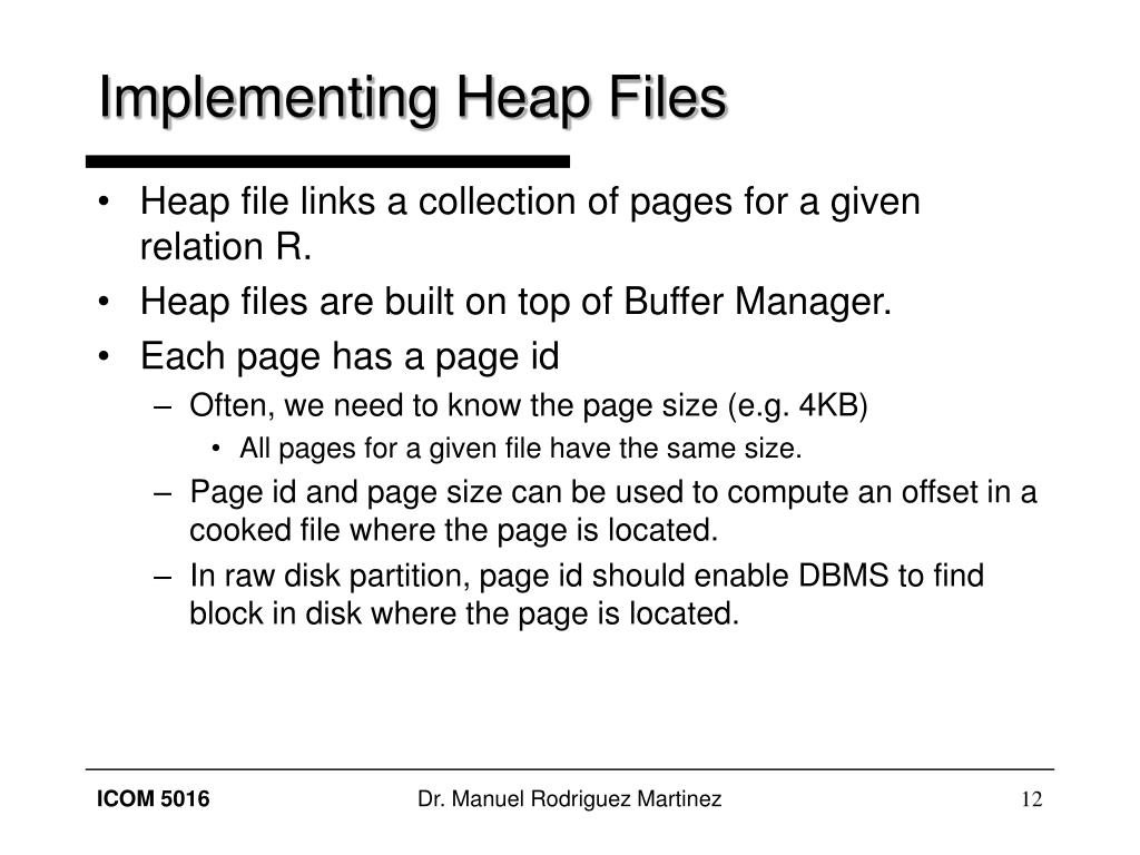 Implementing Heap Files • Heap file links a collection of pages for a given relation R. • Heap files are built on top of Buffer Manager. • Each page has a page id • Often, we need to know the page size (e.g. 4KB) • All pages for a given file have the same size. • Page id and page size can be used to compute an offset in a cooked file where the page is located. • In raw disk partition, page id should enable DBMS to find block in disk where the page is located. Dr. Manuel Rodriguez Martinez