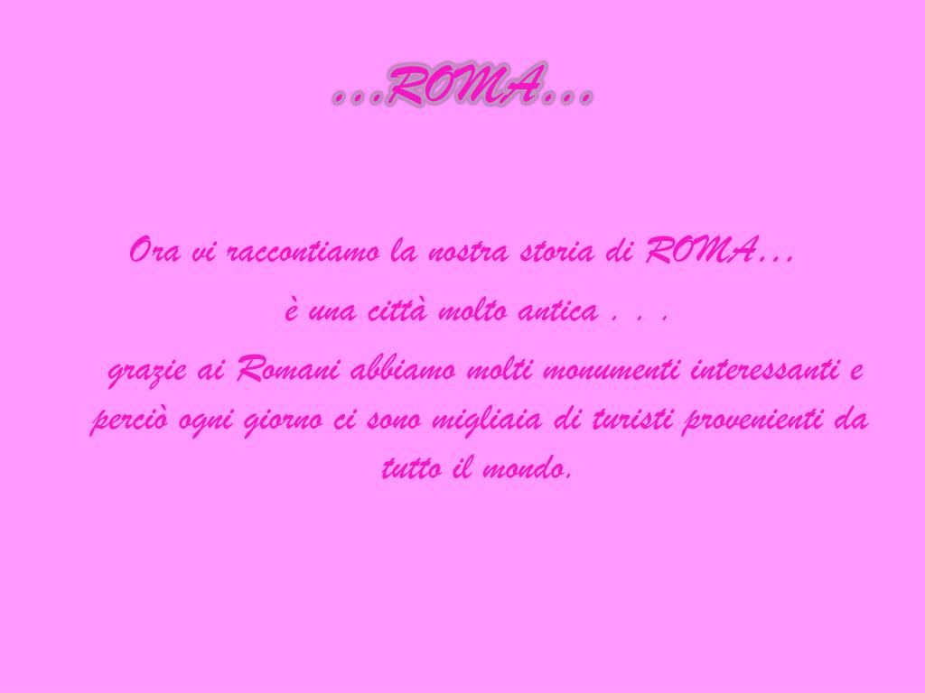 …ROMA… Ora vi raccontiamo la nostra storia di ROMA… è una cittàmolto antica . . . grazie ai Romani abbiamo molti monumenti interessanti e perciò ogni giorno ci sono migliaia di turisti provenienti da tutto il mondo.