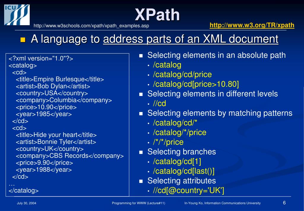 XPointer http://www.w3.org/XML/Linking • Defines the fragment identifier syntax for XML resources • Is based on XPath (extension of XPath) • Returns a set of nodes, points or ranges within the document e.g., #xpointer(id("foo")) xpointer(/chapter[3]/elem[@name="foo"]) http://daniel.veillard.com/Talks/2000-Linking/slide12-0.html Programming for WWW (Lecture#11) In-Young Ko, Information Communications University