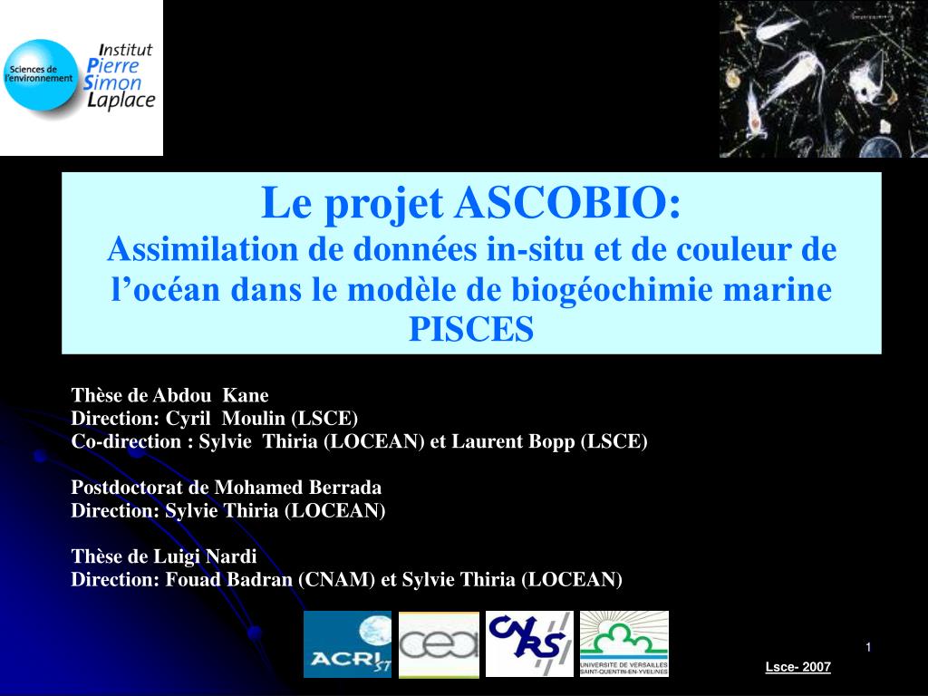 Le projet ASCOBIO: Assimilation de données in-situ et de couleur de l’océan dans le modèle de biogéochimie marine PISCES. Thèse de Abdou Kane Direction: Cyril Moulin (LSCE) Co-direction : Sylvie Thiria (LOCEAN) et Laurent Bopp (LSCE) Postdoctorat de Mohamed Berrada