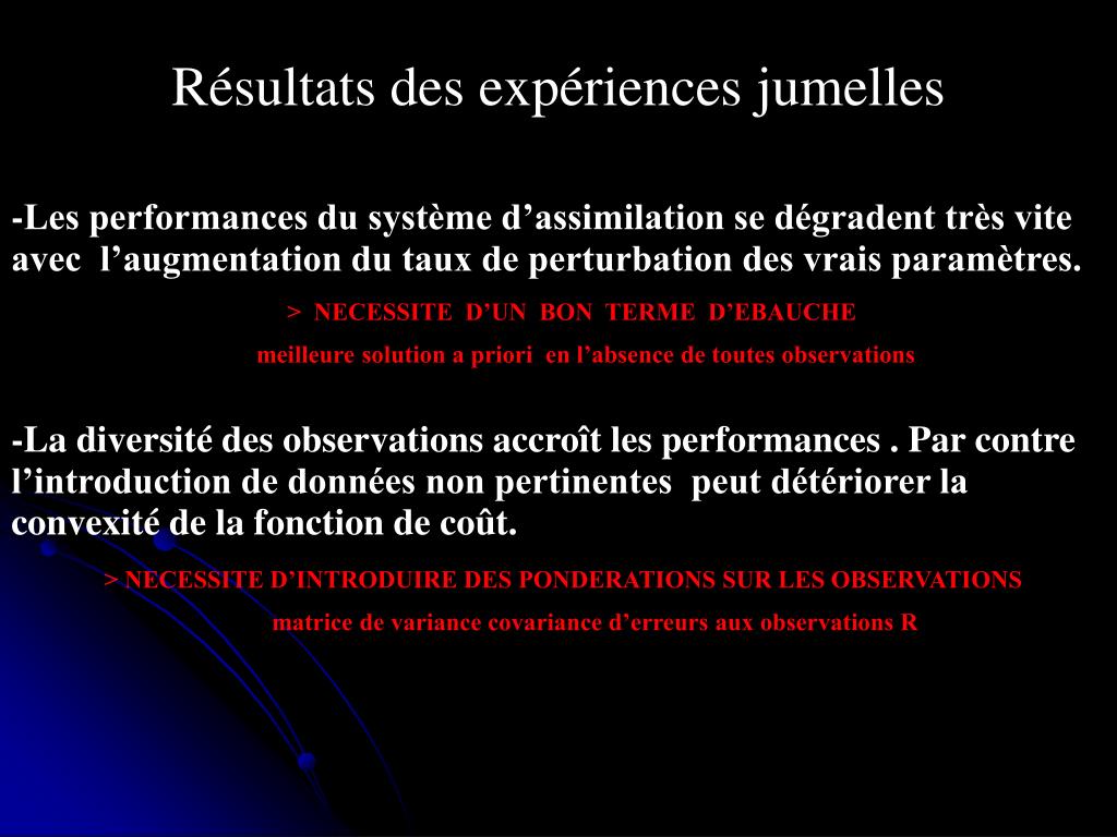 Résultats des expériences jumelles -Les performances du système d’assimilation se dégradent très vite avec l’augmentation du taux de perturbation des vrais paramètres. -La diversité des observations accroît les performances . Par contre l’introduction de données non pertinentes peut détériorer la convexité de la fonction de coût. > NECESSITE D’UN BON TERME D’EBAUCHE meilleure solution a priori en l’absence de toutes observations > NECESSITE D’INTRODUIRE DES PONDERATIONS SUR LES OBSERVATIONS matrice de variance covariance d’erreurs aux observations R