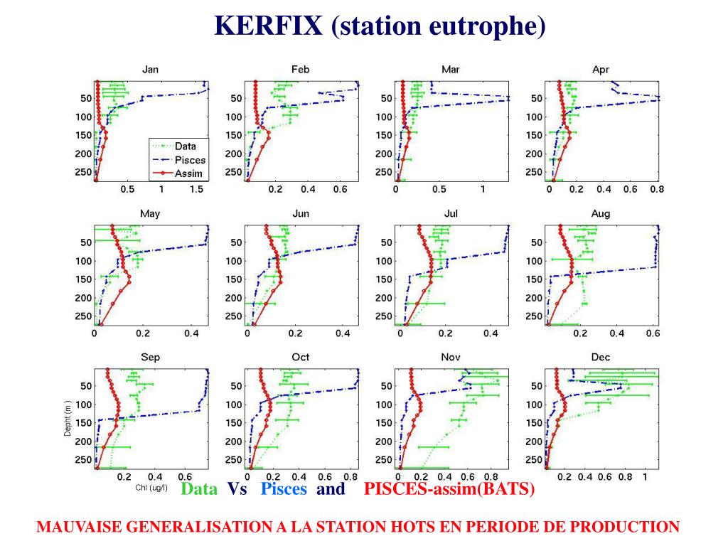 Data Vs Pisces and PISCES-assim(BATS) KERFIX (station eutrophe) MAUVAISE GENERALISATION A LA STATION HOTS EN PERIODE DE PRODUCTION