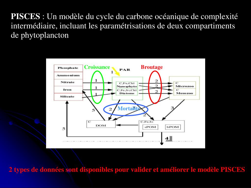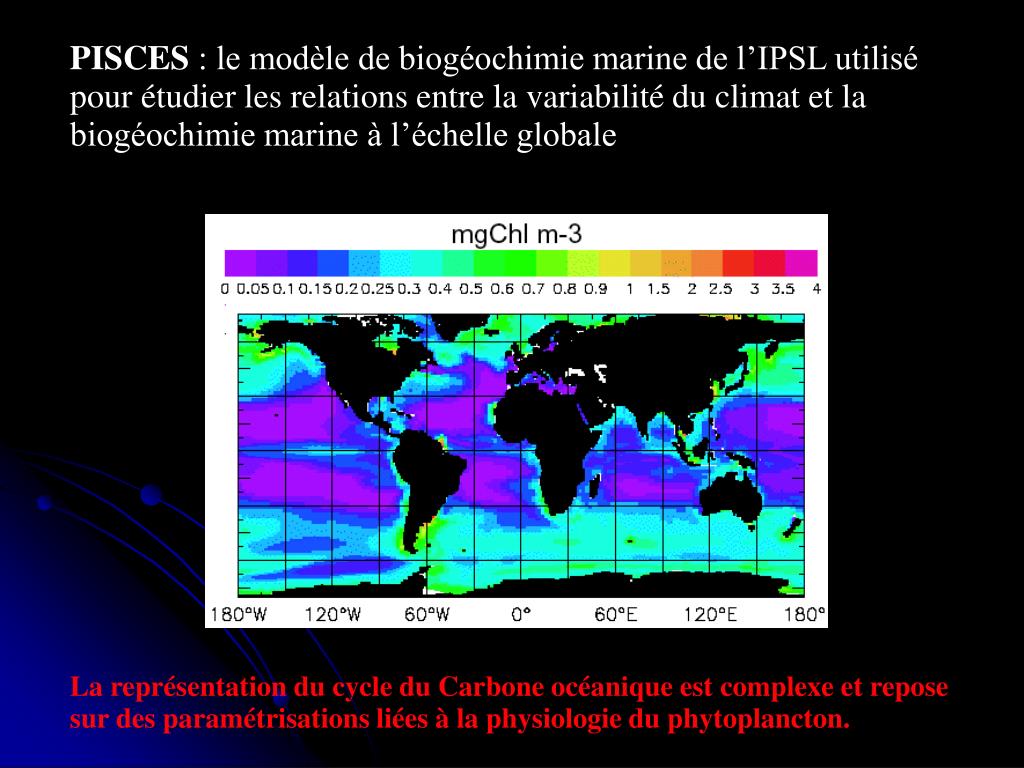 PISCES : le modèle de biogéochimie marine de l’IPSL utilisé pour étudier les relations entre la variabilité du climat et la biogéochimie marine à l’échelle globale La représentation du cycle du Carbone océanique est complexe et repose sur des paramétrisations liées à la physiologie du phytoplancton.