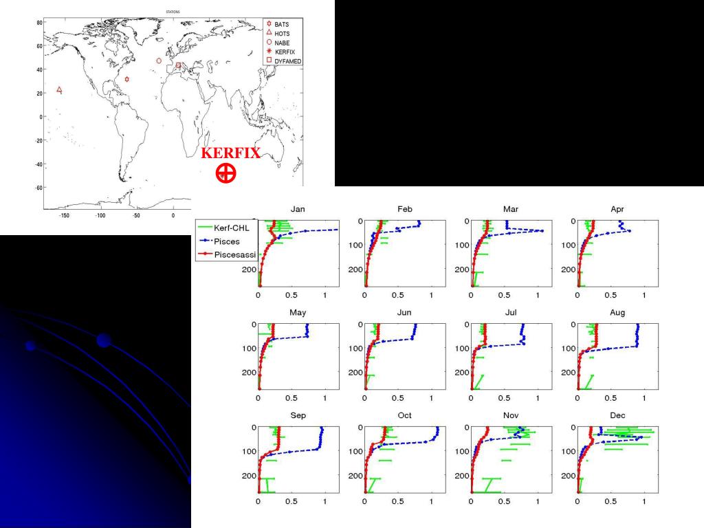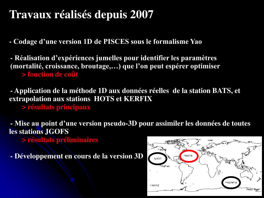 Plan de la thèse Travaux réalisés depuis 2007 - Codage d’une version 1D de PISCES sous le formalisme Yao • - Réalisation d’expériences jumelles pour identifier les paramètres • (mortalité, croissance, broutage,…) que l’on peut espérer optimiser • > fonction de coût • - Application de la méthode 1D aux données réelles de la station BATS, et extrapolation aux stations HOTS et KERFIX • > résultats principaux • - Mise au point d’une version pseudo-3D pour assimiler les données de toutes les stations JGOFS • > résultats préliminaires • - Développement en cours de la version 3D