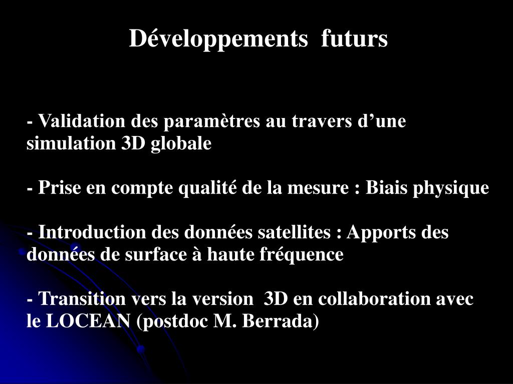 Développements futurs - Validation des paramètres au travers d’une simulation 3D globale - Prise en compte qualité de la mesure : Biais physique - Introduction des données satellites : Apports des données de surface à haute fréquence - Transition vers la version 3D en collaboration avec le LOCEAN (postdoc M. Berrada)