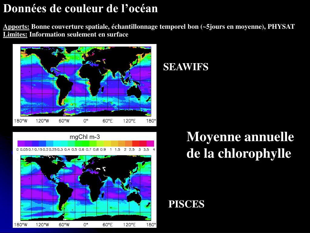 Données de couleur de l’océan Apports: Bonne couverture spatiale, échantillonnage temporel bon (~5jours en moyenne), PHYSAT Limites: Information seulement en surface SEAWIFS Moyenne annuelle de la chlorophylle PISCES