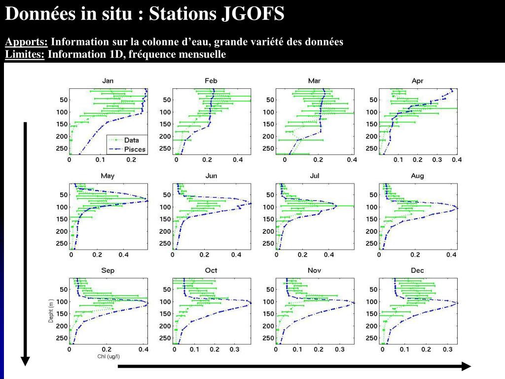 Données in situ : Stations JGOFS Apports: Information sur la colonne d’eau, grande variété des données Limites: Information 1D, fréquence mensuelle Profondeur ( m ) CHL ug/l