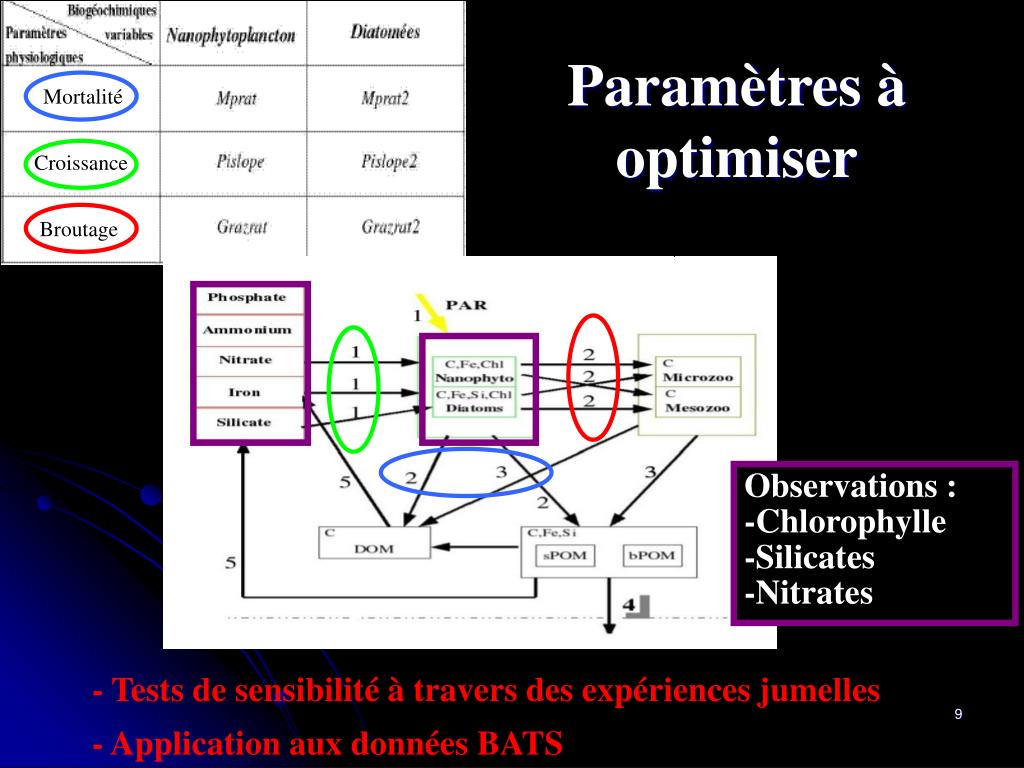 Paramètres à optimiser Mortalité Croissance Broutage Observations : -Chlorophylle -Silicates -Nitrates • - Tests de sensibilité à travers des expériences jumelles • - Application aux données BATS