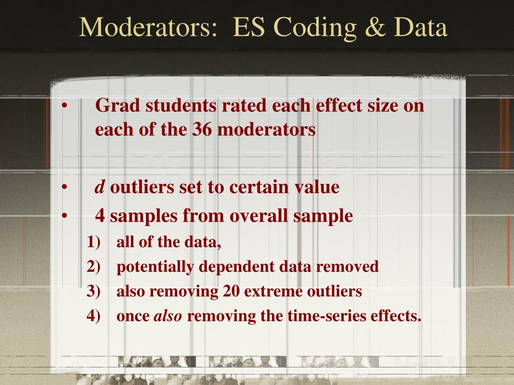 Moderators: ES Coding & Data • Grad students rated each effect size on each of the 36 moderators • d outliers set to certain value • 4 samples from overall sample • all of the data, • potentially dependent data removed • also removing 20 extreme outliers • once also removing the time-series effects.