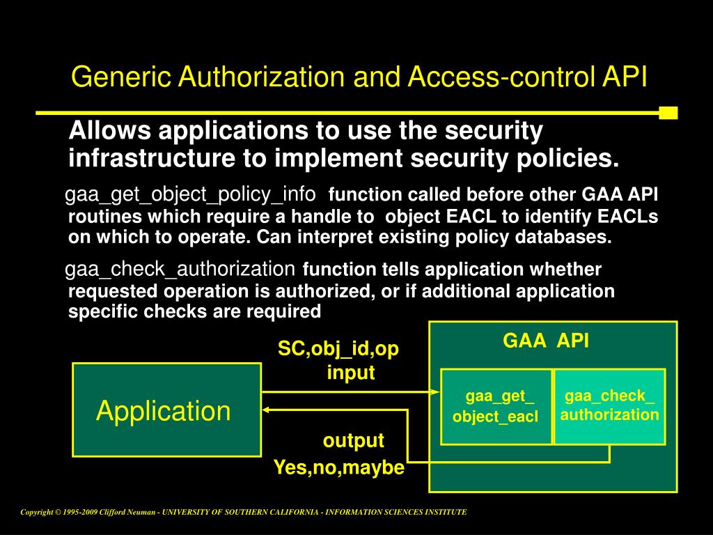 GAA API SC,obj_id,op input gaa_get_ object_eacl gaa_check_ authorization Application output Yes,no,maybe Generic Authorization and Access-control API • Allows applications to use the security infrastructure to implement security policies. gaa_get_object_policy_info function called before other GAA API routines which require a handle to object EACL to identify EACLs on which to operate. Can interpret existing policy databases. gaa_check_authorizationfunction tells application whether requested operation is authorized, or if additional application specific checks are required 9