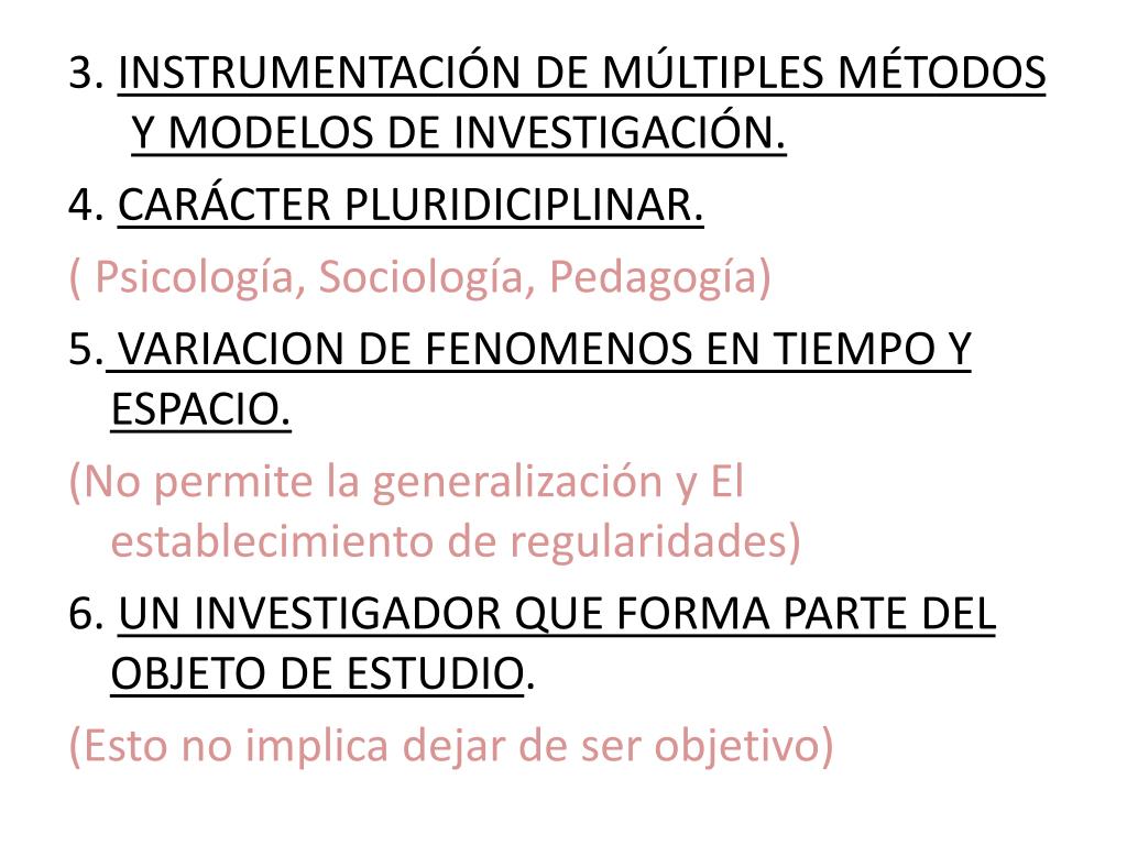 3. INSTRUMENTACIÓN DE MÚLTIPLES MÉTODOS Y MODELOS DE INVESTIGACIÓN. 4. CARÁCTER PLURIDICIPLINAR. ( Psicología, Sociología, Pedagogía) 5. VARIACION DE FENOMENOS EN TIEMPO Y ESPACIO. (No permite la generalización y El establecimiento de regularidades) 6. UN INVESTIGADOR QUE FORMA PARTE DEL OBJETO DE ESTUDIO. (Esto no implica dejar de ser objetivo)