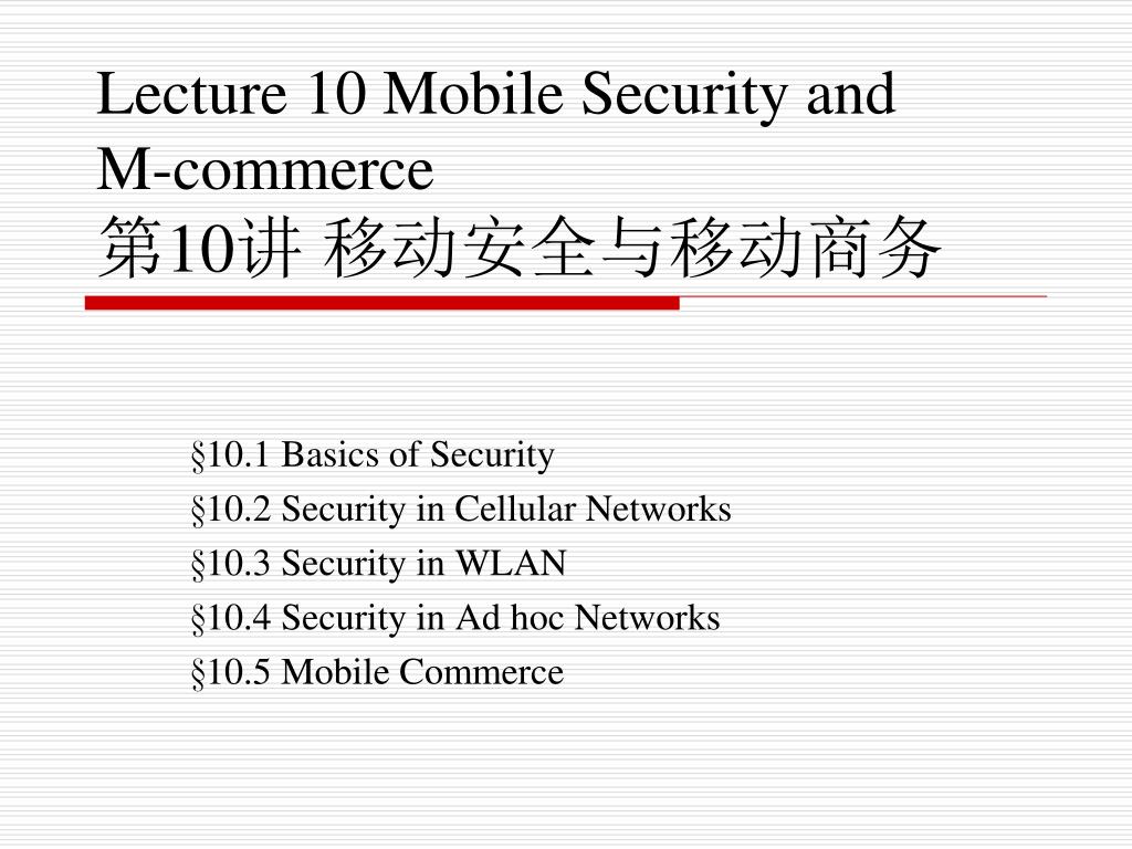 Lecture 10 Mobile Security and M-commerce第10讲 移动安全与移动商务 §10.1 Basics of Security §10.2 Security in Cellular Networks §10.3 Security in WLAN §10.4 Security in Ad hoc Networks §10.5 Mobile Commerce