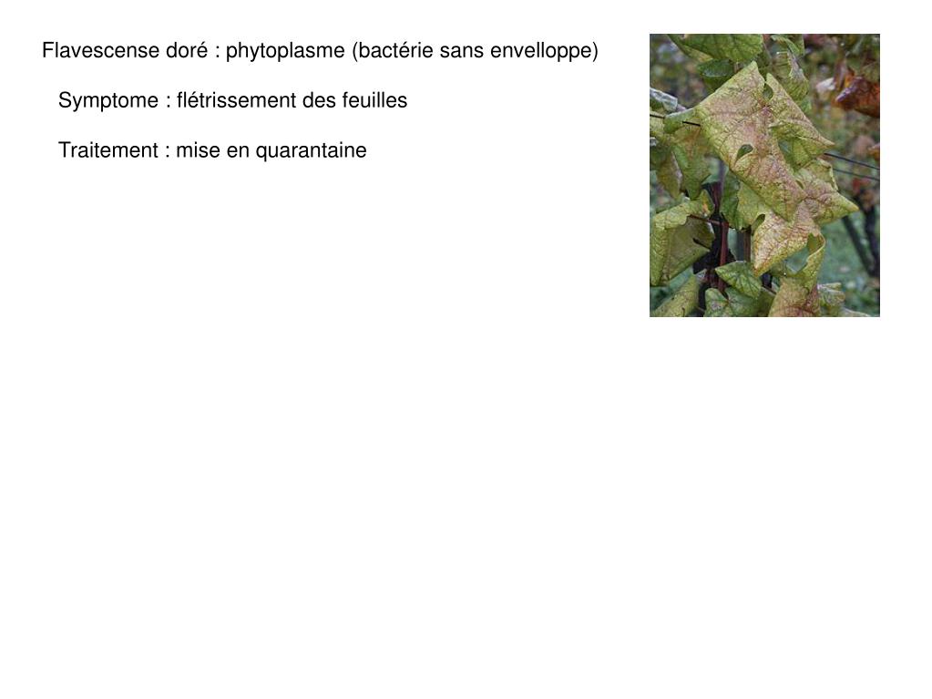 Flavescense doré : phytoplasme (bactérie sans envelloppe) Symptome : flétrissement des feuilles Traitement : mise en quarantaine