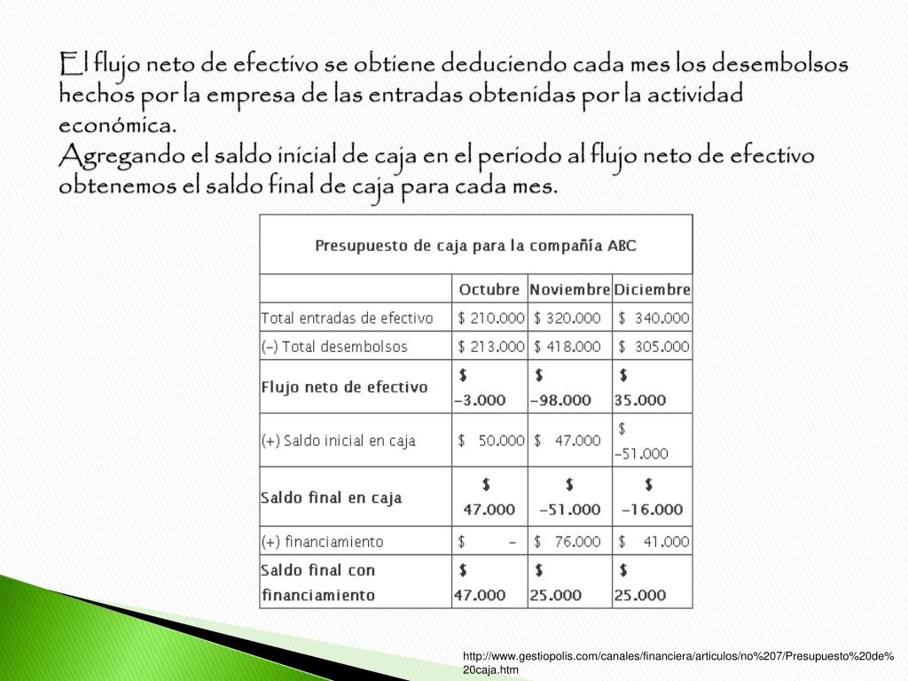 El flujo neto de efectivo se obtiene deduciendo cada mes los desembolsos hechos por la empresa de las entradas obtenidas por la actividad económica. Agregando el saldo inicial de caja en el periodo al flujo neto de efectivo obtenemos el saldo final de caja para cada mes. http://www.gestiopolis.com/canales/financiera/articulos/no%207/Presupuesto%20de%20caja.htm