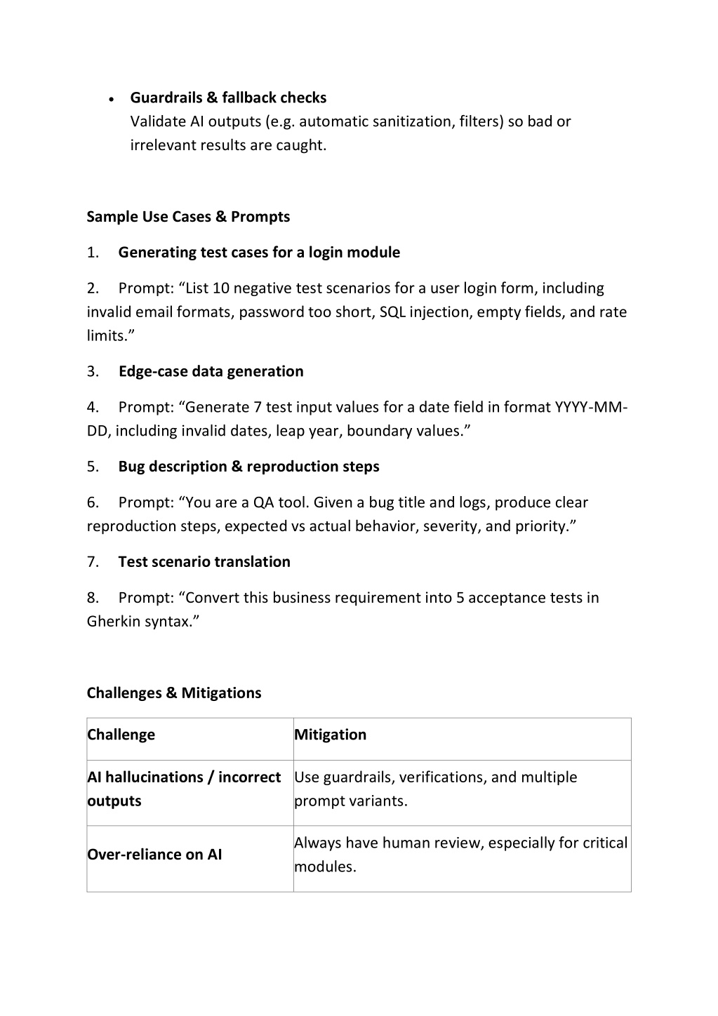 Guardrails & fallback checks Validate AI outputs (e.g. automatic sanitization, filters) so bad or irrelevant results are caught. Sample Use Cases & Prompts 1. Generating test cases for a login module 2. Prompt: “List 10 negative test scenarios for a user login form, including invalid email formats, password too short, SQL injection, empty fields, and rate limits.” 3. Edge-case data generation 4. Prompt: “Generate 7 test input values for a date field in format YYYY-MM- DD, including invalid dates, leap year, boundary values.” 5. Bug description & reproduction steps 6. Prompt: “You are a QA tool. Given a bug title and logs, produce clear reproduction steps, expected vs actual behavior, severity, and priority.” 7. Test scenario translation 8. Prompt: “Convert this business requirement into 5 acceptance tests in Gherkin syntax.” Challenges & Mitigations Challenge Mitigation AI hallucinations / incorrect outputs Use guardrails, verifications, and multiple prompt variants. Always have human review, especially for critical modules. Over-reliance on AI
