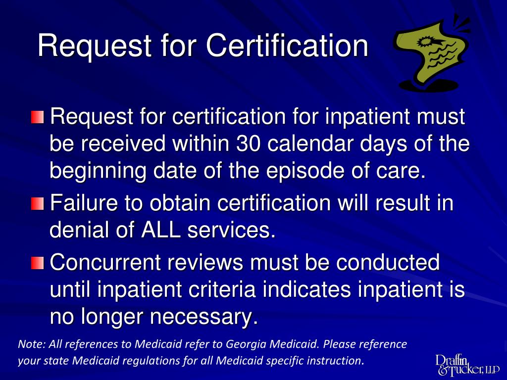 Request for Certification • Request for certification for inpatient must be received within 30 calendar days of the beginning date of the episode of care. • Failure to obtain certification will result in denial of ALL services. • Concurrent reviews must be conducted until inpatient criteria indicates inpatient is no longer necessary. Note: All references to Medicaid refer to Georgia Medicaid. Please reference your state Medicaid regulations for all Medicaid specific instruction.