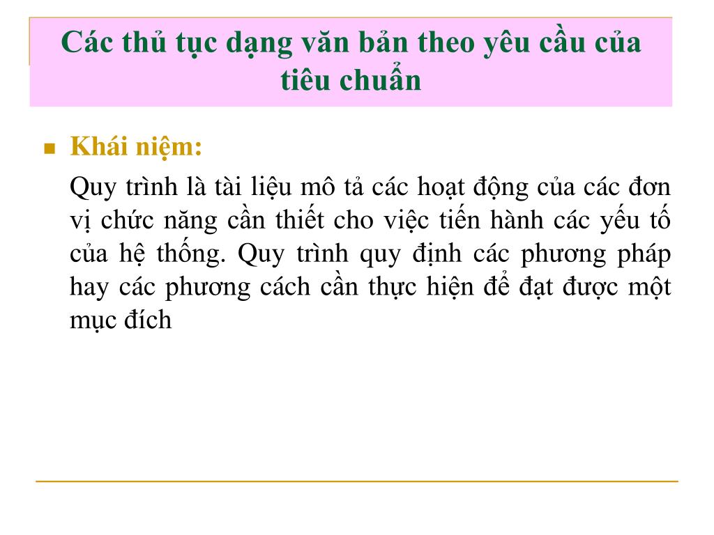 Các thủ tục dạng văn bản theo yêu cầu của tiêu chuẩn • Khái niệm: Quy trình là tài liệu mô tả các hoạt động của các đơn vị chức năng cần thiết cho việc tiến hành các yếu tố của hệ thống. Quy trình quy định các phương pháp hay các phương cách cần thực hiện để đạt được một mục đích