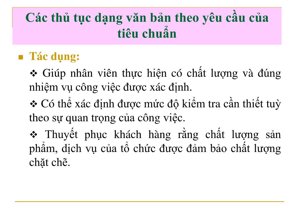 Các thủ tục dạng văn bản theo yêu cầu của tiêu chuẩn • Tác dụng: Giúp nhân viên thực hiện có chất lượng và đúng nhiệm vụ công việc được xác định. Có thể xác định được mức độ kiểm tra cần thiết tuỳ theo sự quan trọng của công việc. Thuyết phục khách hàng rằng chất lượng sản phẩm, dịch vụ của tổ chức được đảm bảo chất lượng chặt chẽ.