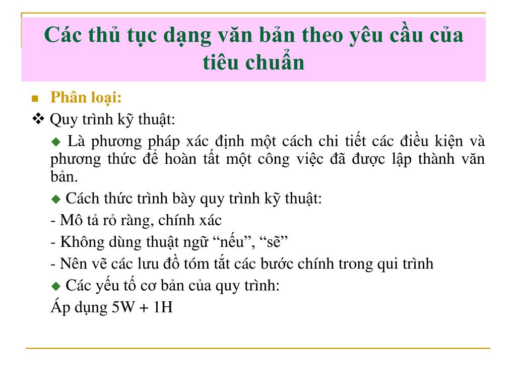 Các thủ tục dạng văn bản theo yêu cầu của tiêu chuẩn • Phân loại: Quy trình kỹ thuật: Là phương pháp xác định một cách chi tiết các điều kiện và phương thức để hoàn tất một công việc đã được lập thành văn bản. Cách thức trình bày quy trình kỹ thuật: - Mô tả rỏ ràng, chính xác - Không dùng thuật ngữ “nếu”, “sẽ” - Nên vẽ các lưu đồ tóm tắt các bước chính trong qui trình Các yếu tố cơ bản của quy trình: Áp dụng 5W + 1H