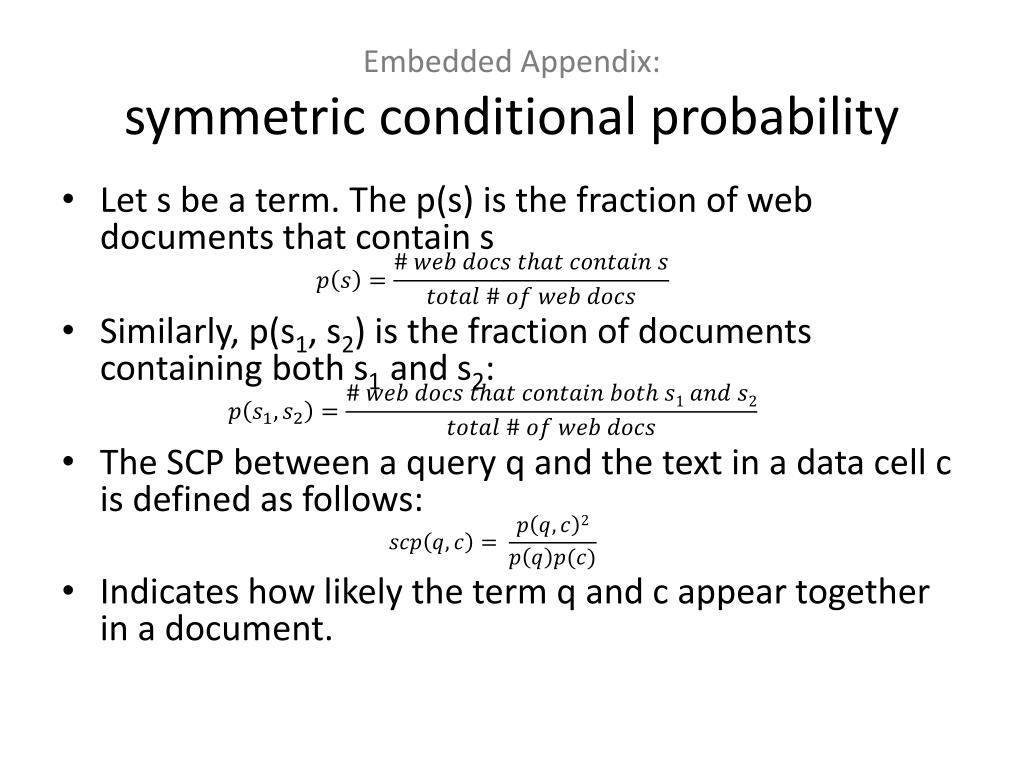 Embedded Appendix:symmetric conditional probability • Let s be a term. The p(s) is the fraction of web documents that contain s • Similarly, p(s1, s2) is the fraction of documents containing both s1 and s2: • The SCP between a query q and the text in a data cell c is defined as follows: • Indicates how likely the term q and c appear together in a document.