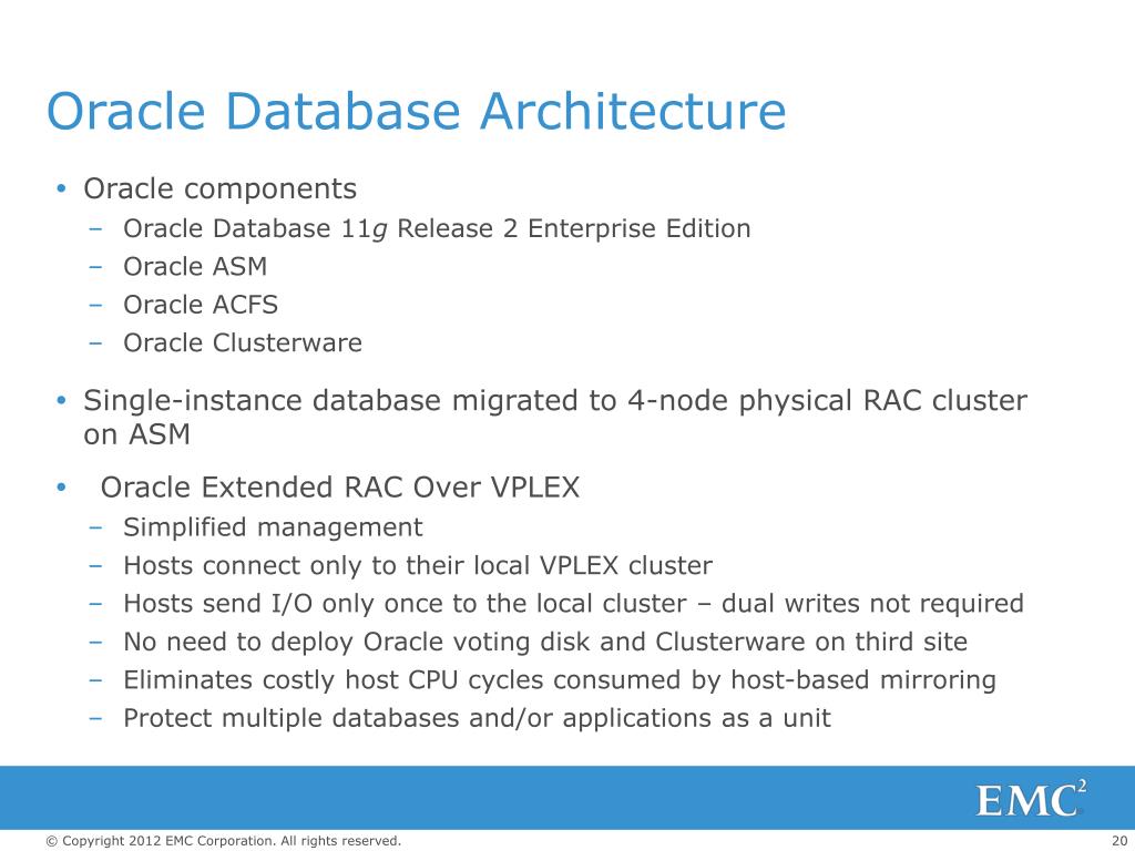Oracle Database Architecture • Oracle components • Oracle Database 11g Release 2 Enterprise Edition • Oracle ASM • Oracle ACFS • Oracle Clusterware • Single-instance database migrated to 4-node physical RAC cluster on ASM • Oracle Extended RAC Over VPLEX • Simplified management • Hosts connect only to their local VPLEX cluster • Hosts send I/O only once to the local cluster – dual writes not required • No need to deploy Oracle voting disk and Clusterware on third site • Eliminates costly host CPU cycles consumed by host-based mirroring • Protect multiple databases and/or applications as a unit