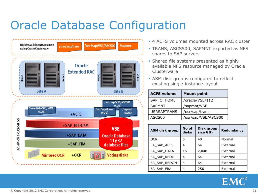 Oracle Database Configuration • 4 ACFS volumes mounted across RAC cluster • TRANS, ASCS500, SAPMNT exported as NFS shares to SAP servers • Shared file systems presented as highly available NFS resource managed by Oracle Clusterware • ASM disk groups configured to reflect existing single-instance layout