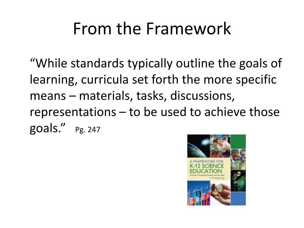 From the Framework “While standards typically outline the goals of learning, curricula set forth the more specific means – materials, tasks, discussions, representations – to be used to achieve those goals.” Pg. 247