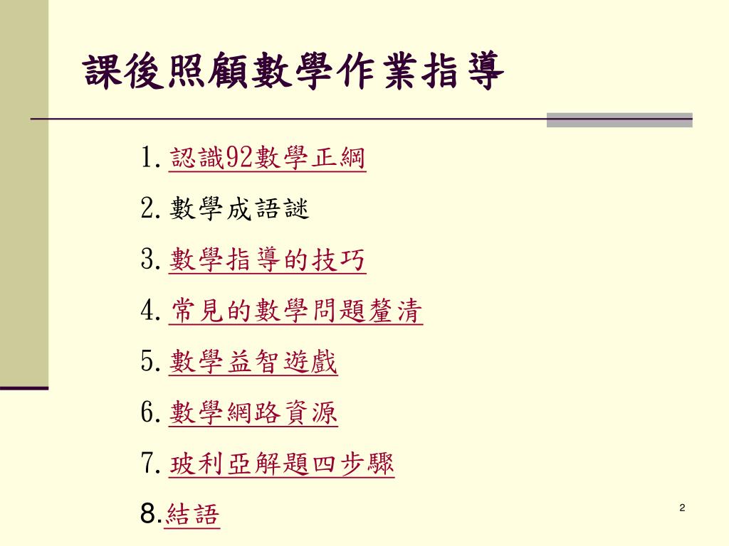 課後照顧數學作業指導 1.認識92數學正綱 2.數學成語謎 3.數學指導的技巧 4.常見的數學問題釐清 5.數學益智遊戲 6.數學網路資源 7.玻利亞解題四步驟 8.結語