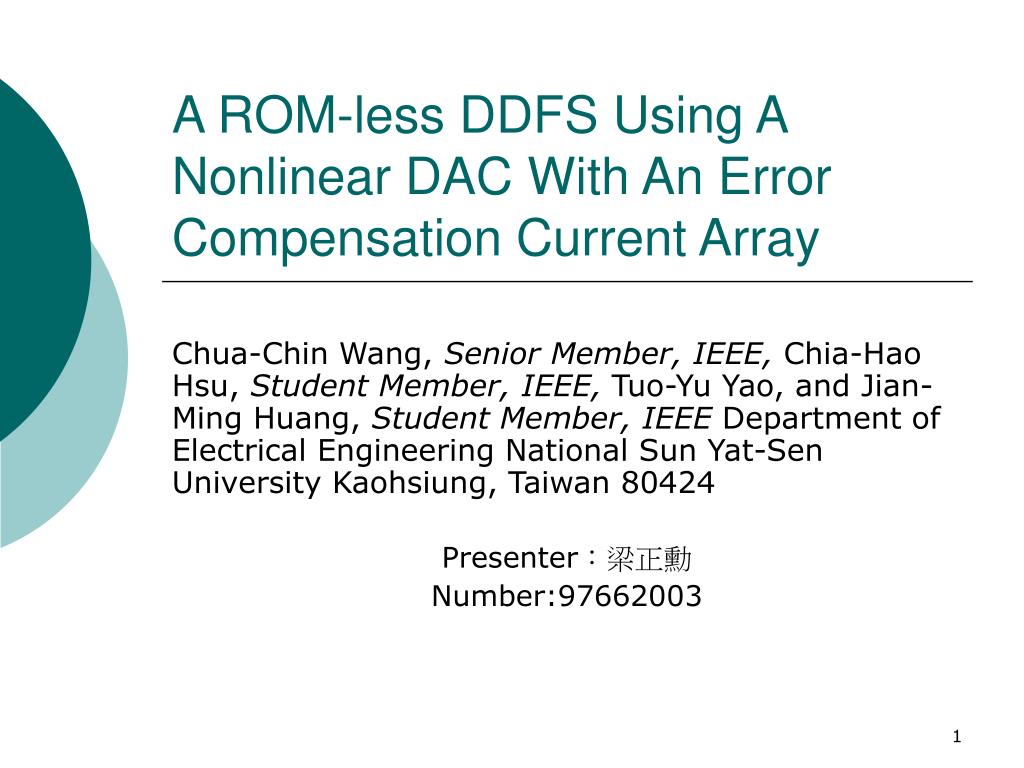 A ROM-less DDFS Using A Nonlinear DAC With An Error Compensation Current Array Chua-Chin Wang, Senior Member, IEEE, Chia-Hao Hsu, Student Member, IEEE, Tuo-Yu Yao, and Jian-Ming Huang, Student Member, IEEE Department of Electrical Engineering National Sun Yat-Sen University Kaohsiung, Taiwan 80424 Presenter:梁正勳 Number:97662003