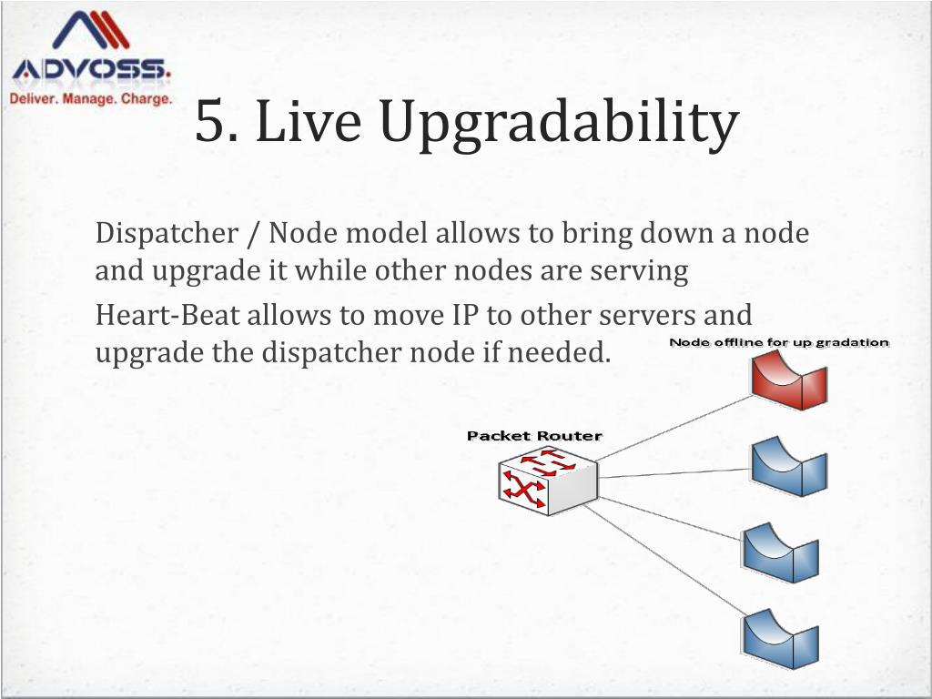 5. Live Upgradability Dispatcher / Node model allows to bring down a node and upgrade it while other nodes are serving Heart-Beat allows to move IP to other servers and upgrade the dispatcher node if needed.