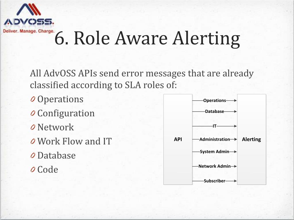 6. Role Aware Alerting All AdvOSS APIs send error messages that are already classified according to SLA roles of: • Operations • Configuration • Network • Work Flow and IT • Database • Code