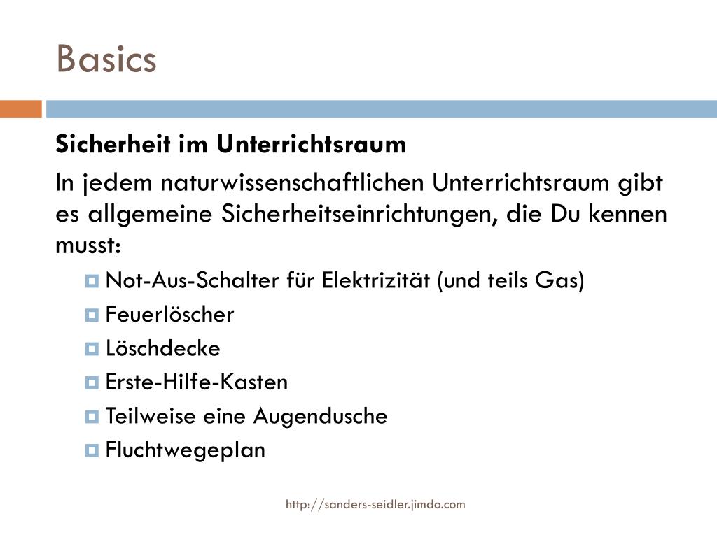 Basics Sicherheit im Unterrichtsraum In jedem naturwissenschaftlichen Unterrichtsraum gibt es allgemeine Sicherheitseinrichtungen, die Du kennen musst: • Not-Aus-Schalter für Elektrizität (und teils Gas) • Feuerlöscher • Löschdecke • Erste-Hilfe-Kasten • Teilweise eine Augendusche • Fluchtwegeplan http://sanders-seidler.jimdo.com